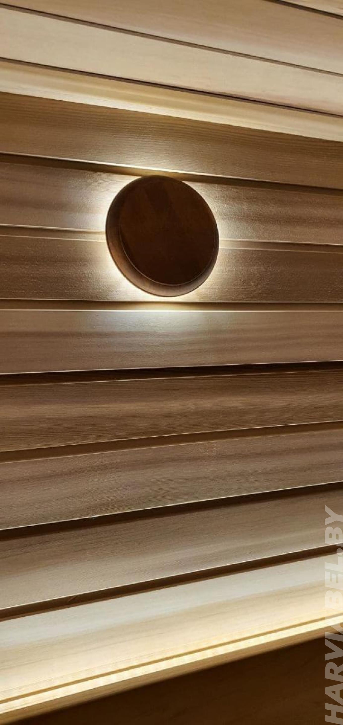 В качестве отделочного материала для стен и полок использовался премиальный материал - канадский кедр. Это дерево зарекомендовало себя с лучшей стороны среди любителей банных процедур. Важный момент заключается в том, что канадский кедр плохо нагревается. А это значит, что баней может пользоваться даже неподготовленный посетитель.