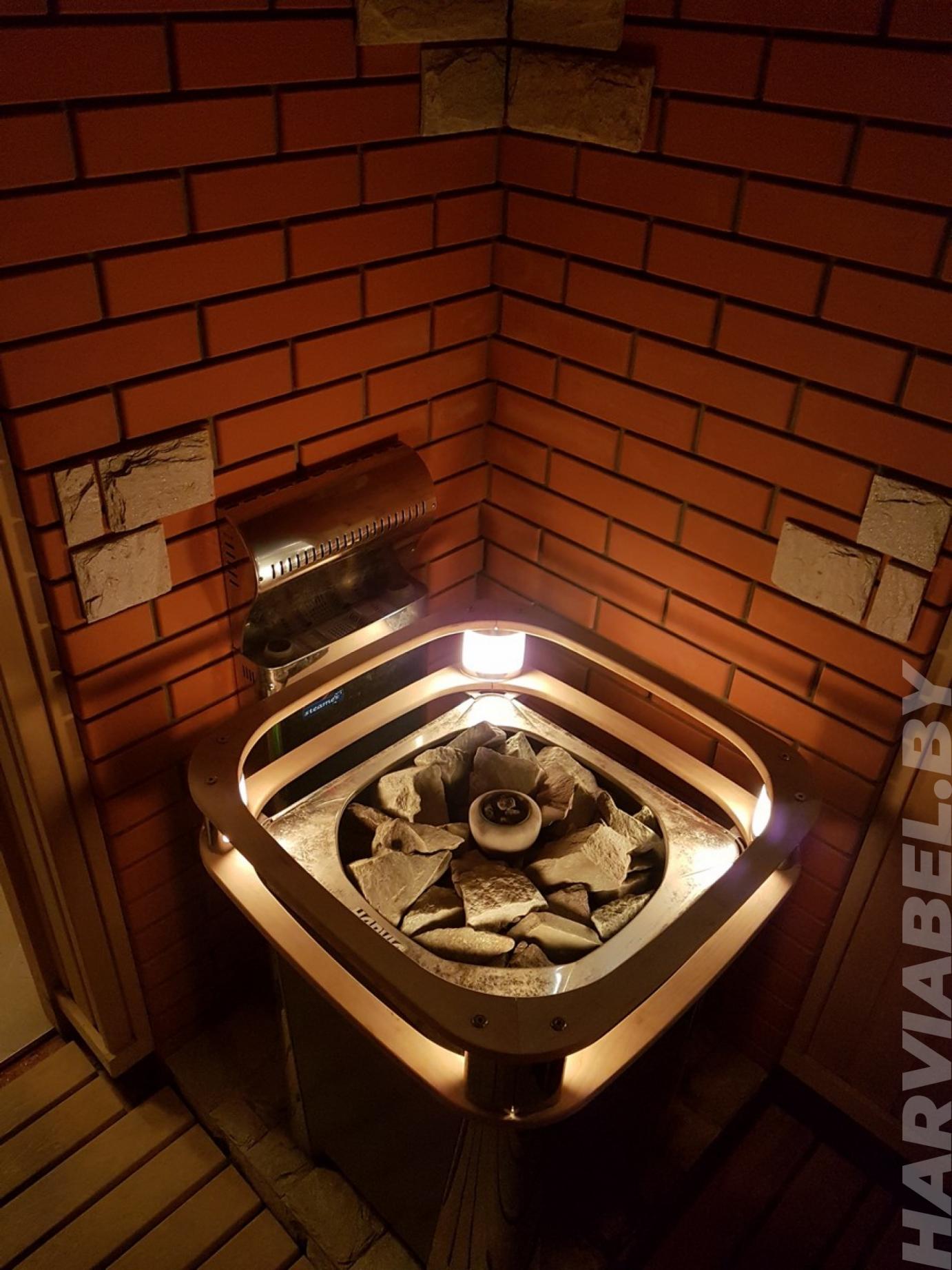 Отделка этой парной была выполнена из липы. Полоки были изготовлены из африканского абаша. Ценная древесина дерева абаш для бани отличается прочностью, мягкостью и устойчивостью форм. Главным свойством, которым отличается абаш для бани, считается низкая теплопроводность его древесины. Благодаря данной особенности, доски африканского дуба не обожгут кожу человека во время принятия процедур в бане.Была установлена электрическая печь Harvia Elegance. Отличительной особенностью этой каменки является оригинальная форма и необычный дизайн. Управляется электропечь с помощью отдельного пульта Harvia, который устанавливается вне парилки. Особенностью данного проекта электропарной стали абажуры, выполненные в форме факела, это придало помещению свой индивидуальный и ни на кого непохожий стиль. За электрокаменкой была установлена декоративная стенка из плитки имитирующей кирпичную кладку. Срок реализации проекта составил 7 дней.