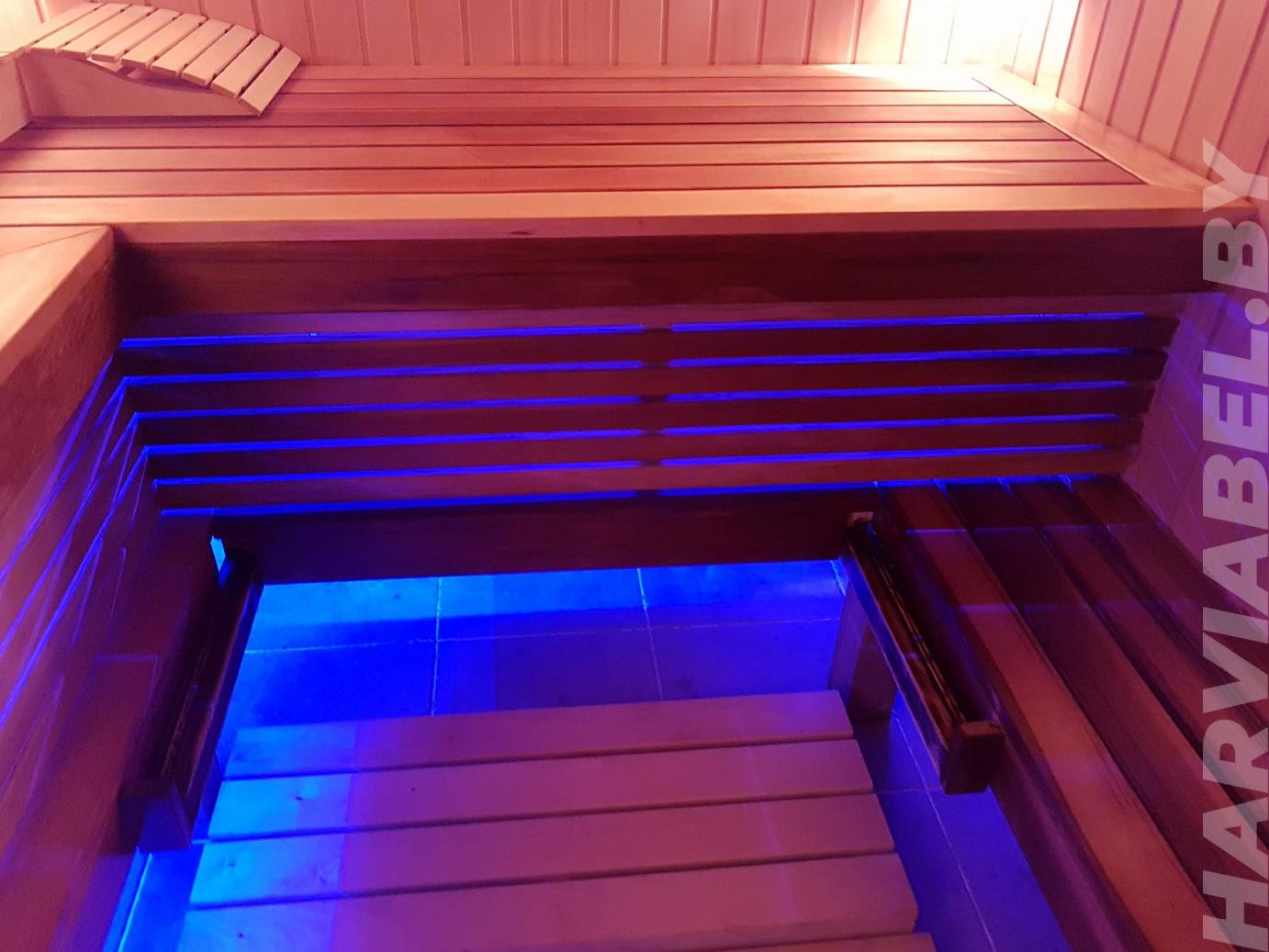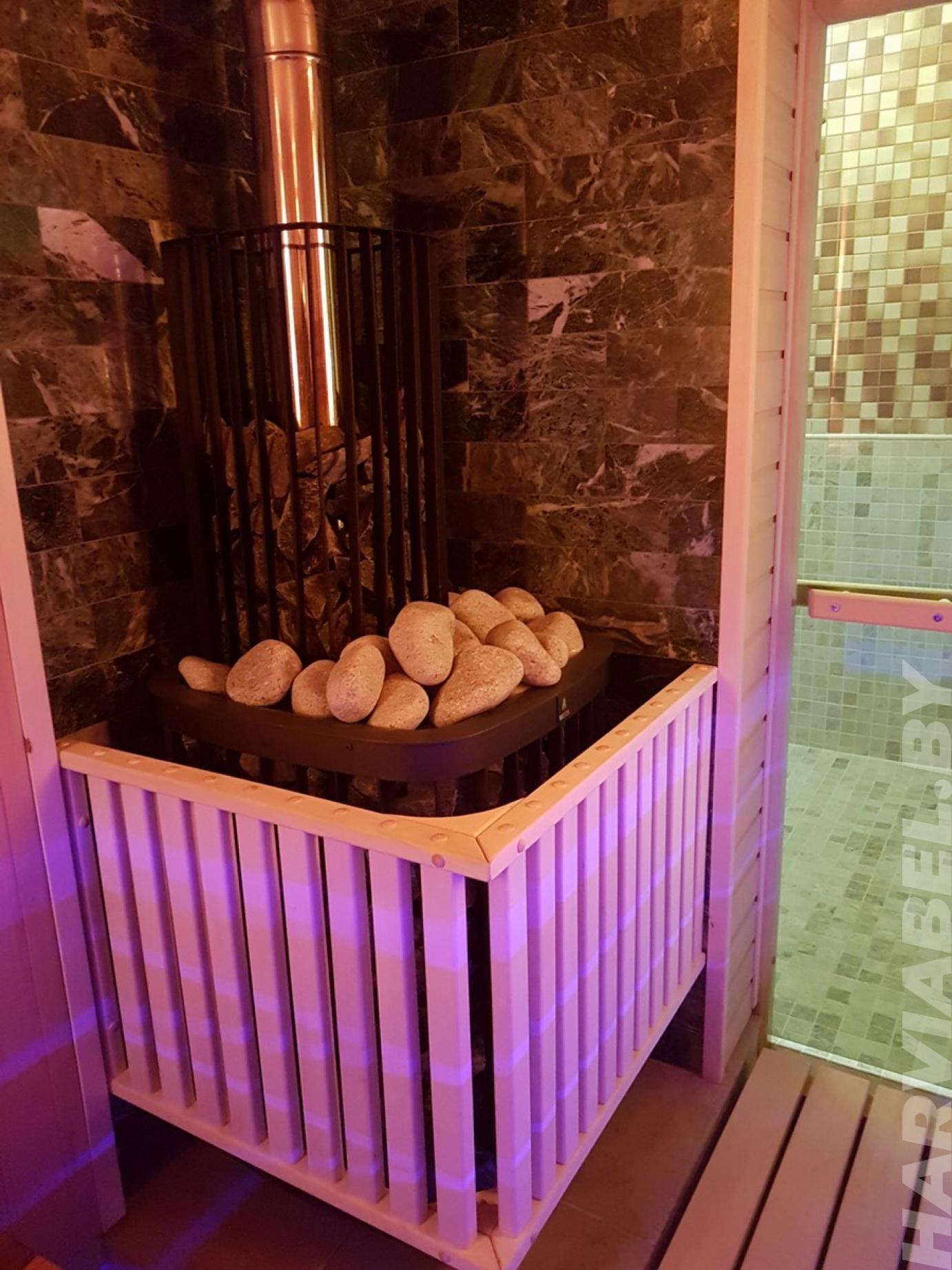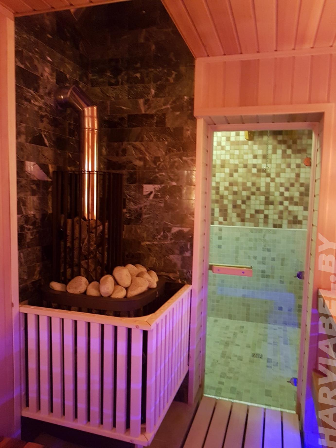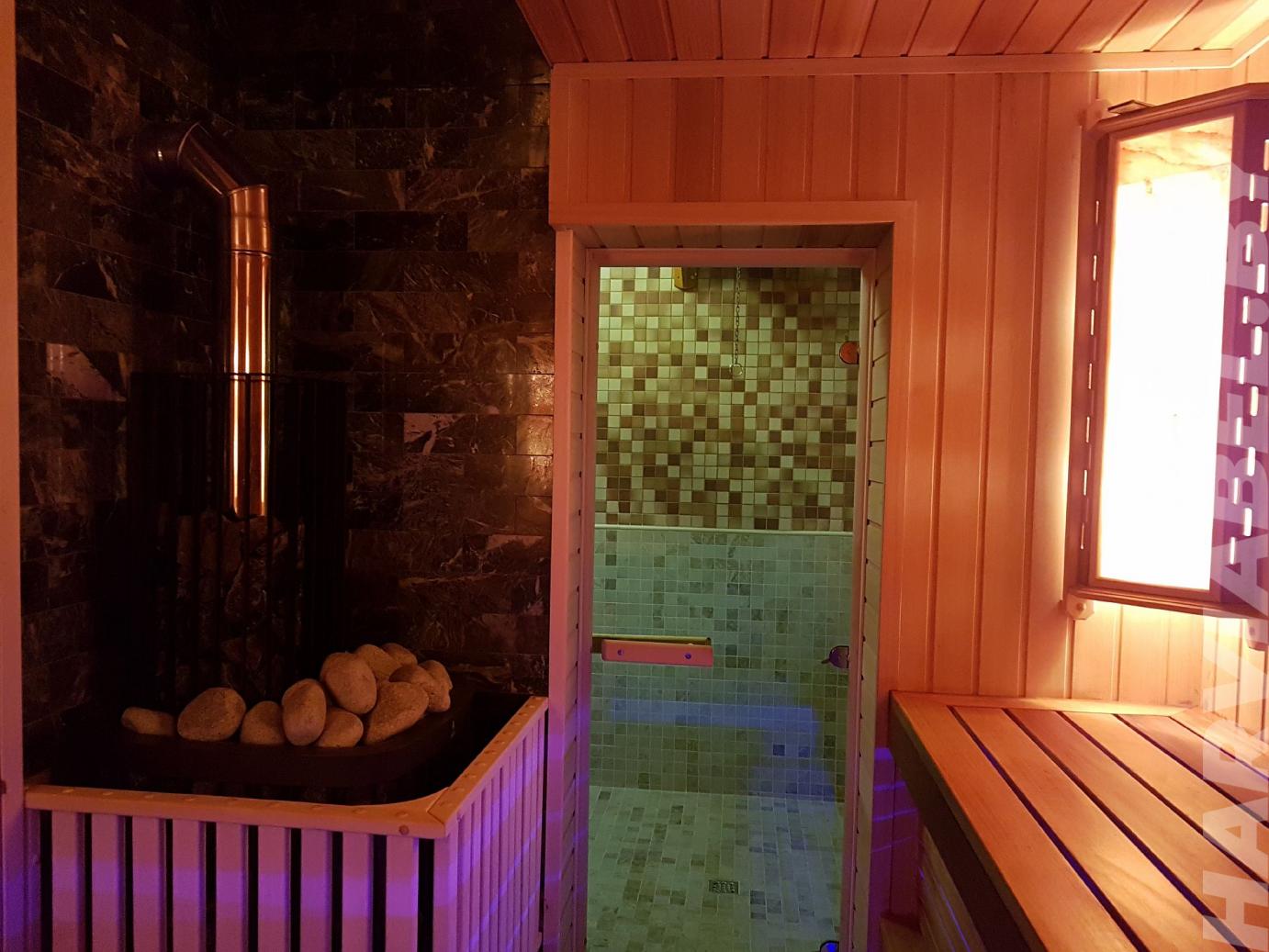 Наша команда спроектировала, изготовила и установила кедровую парную с дровяной печью Kastor Saga 20 Ksil. Данная каменка изготовлена лучшими финскими мастерами исключительно из высококачественной конструкционной стали. Большое количество камней, уложенных вокруг топки каменки, позволяет быстро и эффективно прогреть помещение и поддерживать стабильную температуру в помещении, даже если огонь ненадолго угаснет. Вагонка и полоки были изготовлены из канадского кедра, который является материалом для изготовления элитных парных. Цвет досок не меняется с течением времени. Кедр имеет массу оздоравливающих и целебных свойств, а сама древесина обладает приятным ароматом, а ее эфирные масла имеют также множество целебных свойств. Вокруг печи была установлена декоративная стена из плитки змеевик. Дверь выполнена из жаростойкого и высокопрочного стекла, она позволила парной гармонично вписаться в помещение. Срок реализации проекта составил 7 дней.