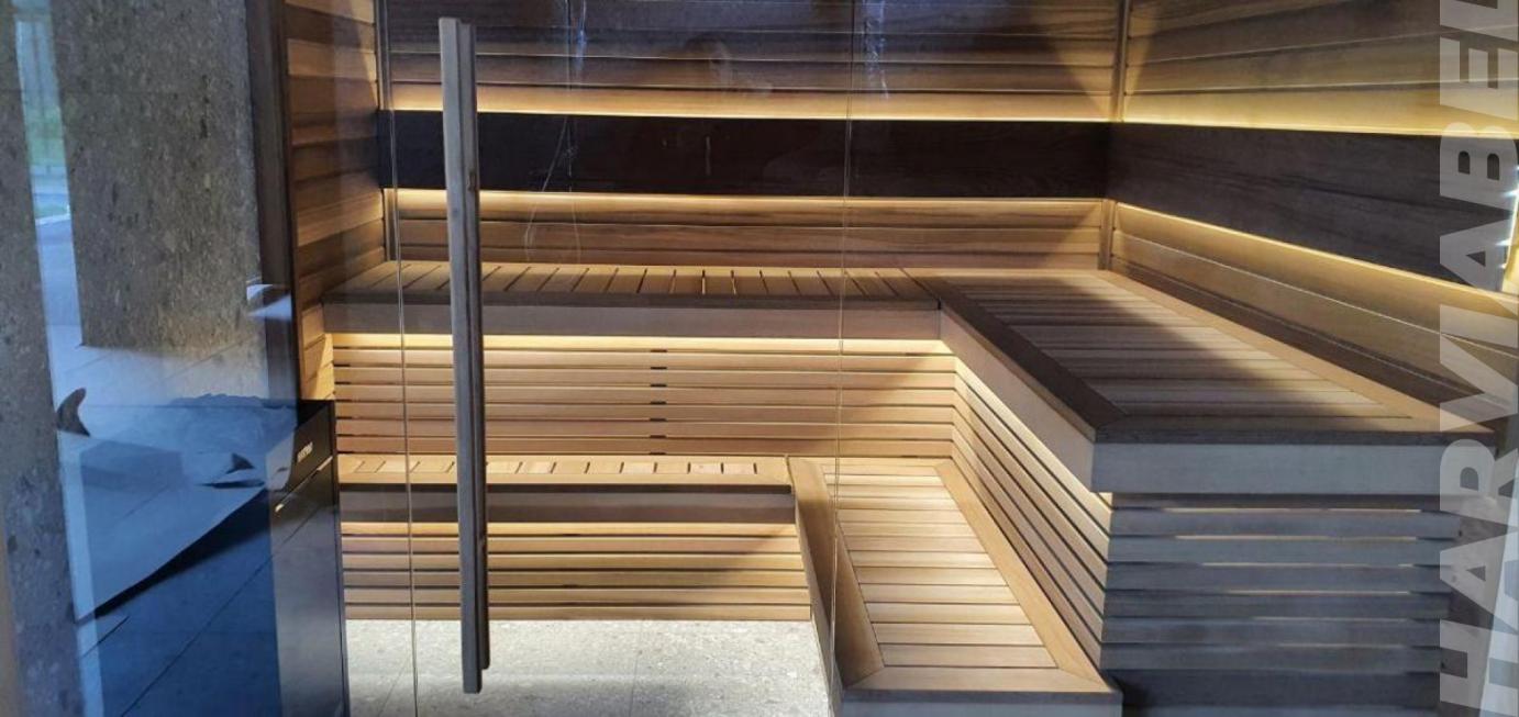 Современная архитектура и материалы позволяют создавать уникальные и в то же время стильные интерьеры. Еще полвека назад представить себе прозрачные интерьеры в парной было невозможно и казалось, что об этом могут лишь мечтать фантасты, а сегодня такая возможность существует. Наша команда создала эксклюзивный современный интерьер с помощью сочетания традиционного дерева и закаленного стекла от компании AGC (Израиль). Серия стекол Vision имеют высокое показатели по светопропусканию, при этом обладают отличной термоизоляцией. Для изготовления парной использовалось стекло толщиной в 10мм.
