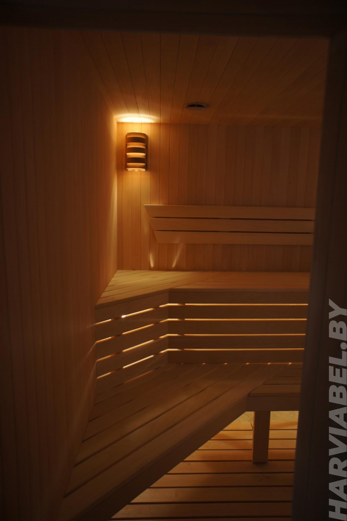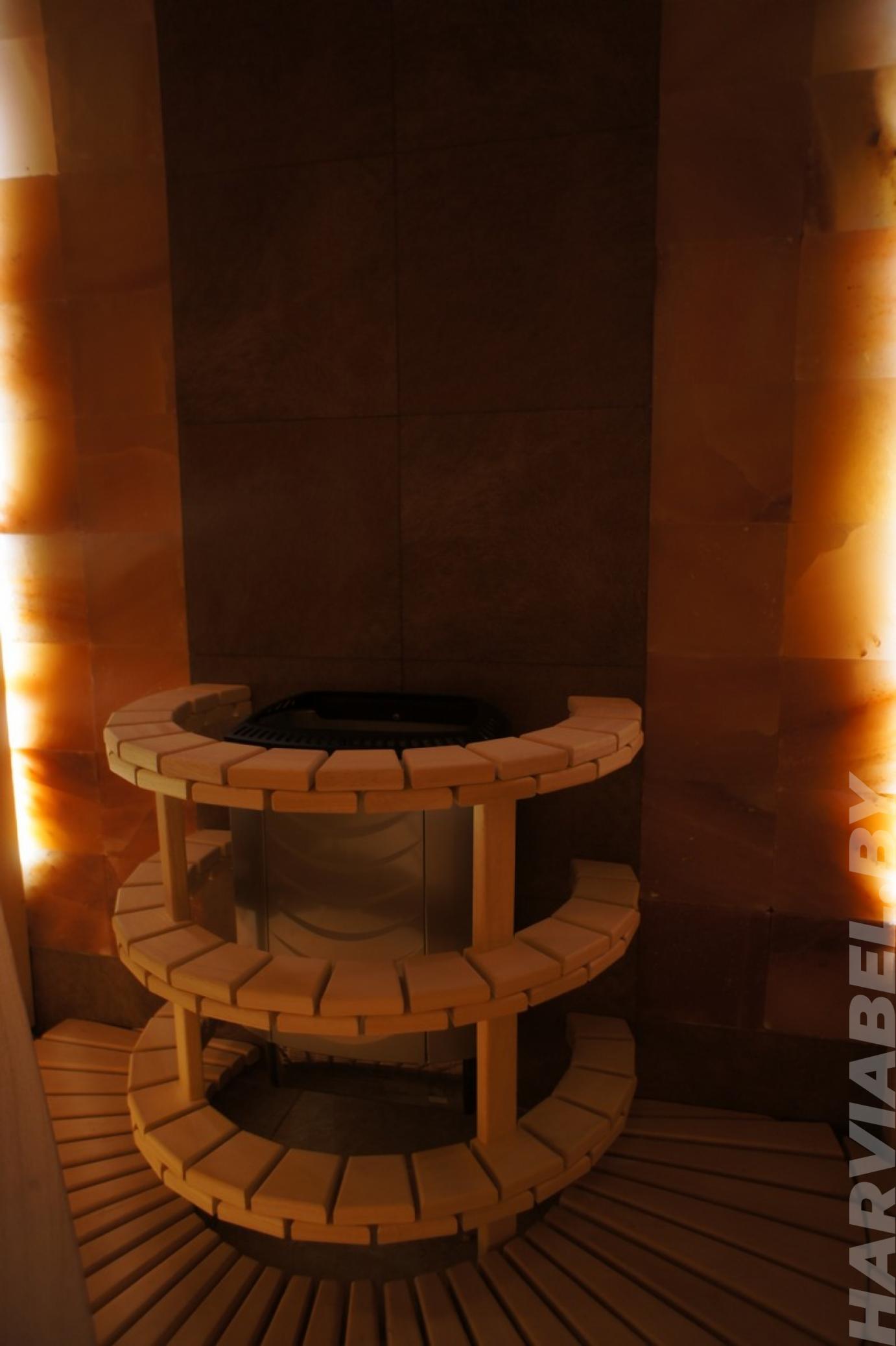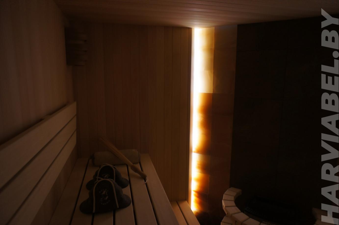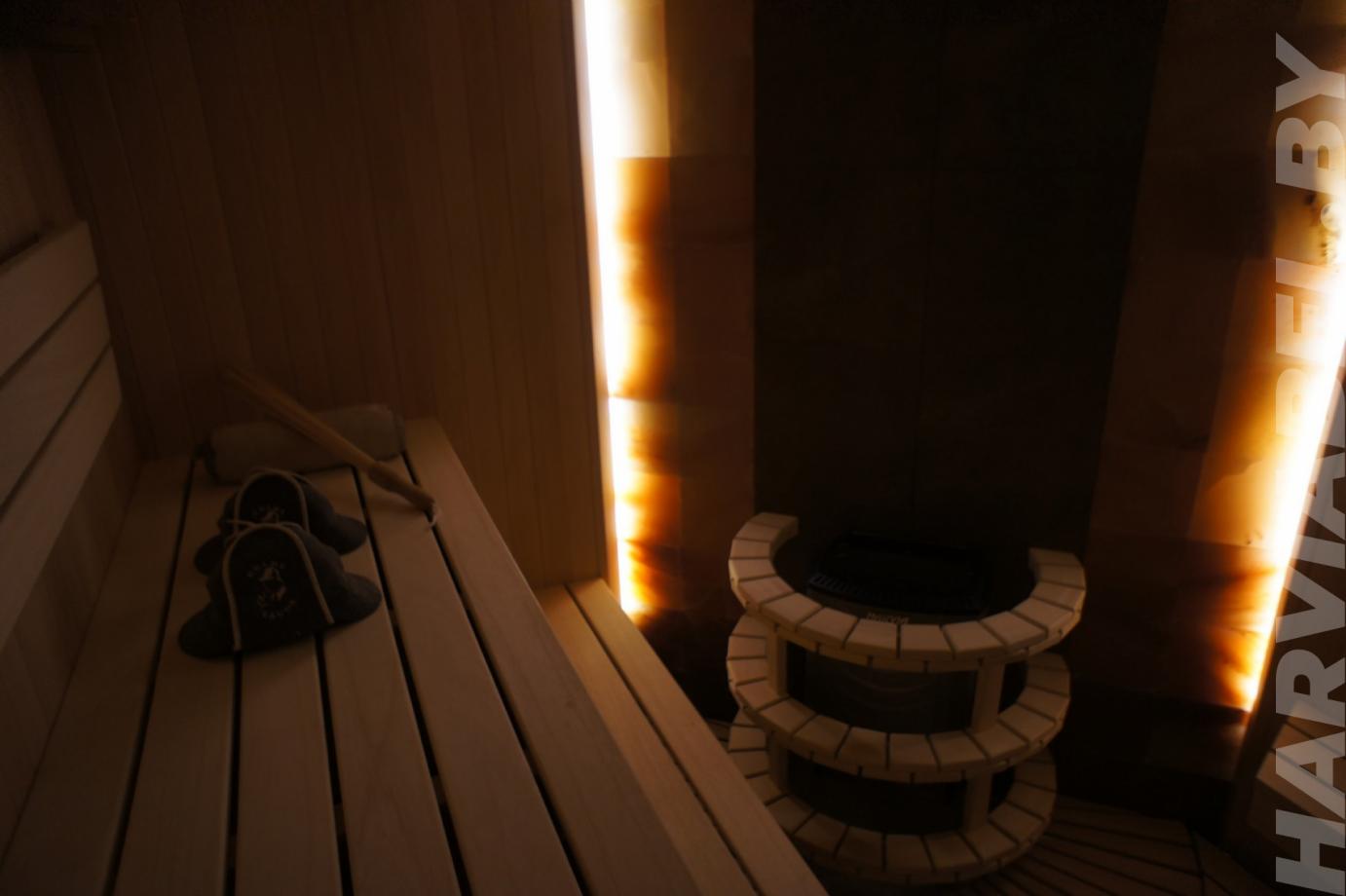 Парная из липы с электропечью Harvia и соляной подсветкой
