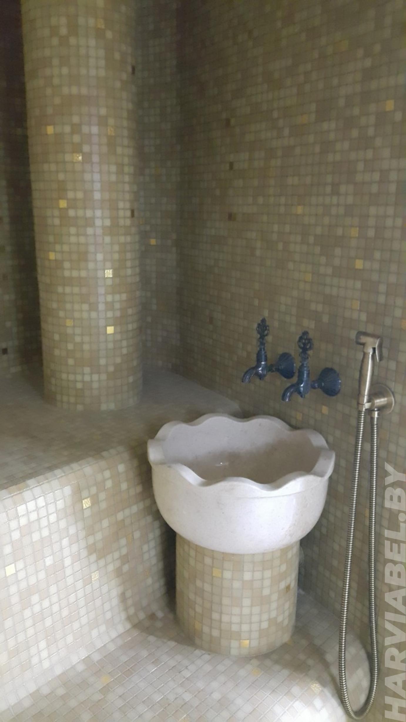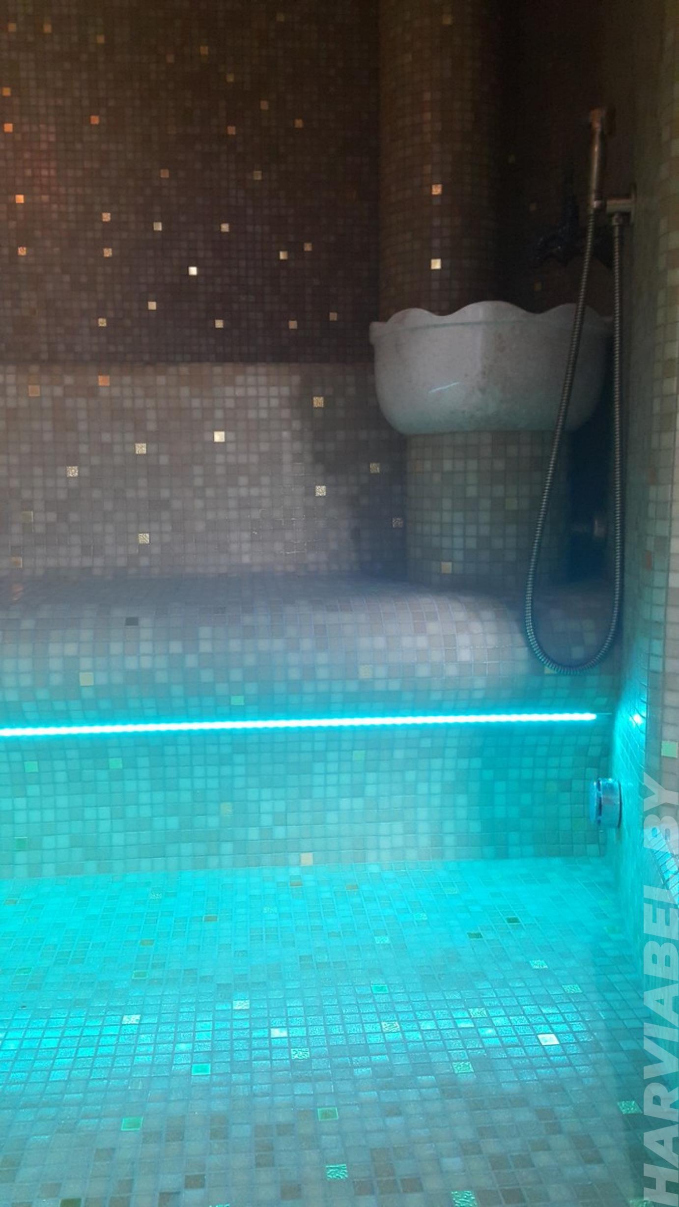Турецкий хахам требует тщательного проекта, чтобы учесть все особенности такой бани. Регулярное посещение турецкого хамама способствует оздоровлению и омоложению всего организма. Преимуществом является интенсивное увлажнение кожи, глубокое очищение и подтягивание кожи. Также выводятся вредные вещества, токсины и шлаки из организма, нормализуется кровообращение, повышается иммунитет. Посещение турецкого хамама расслабляет мышцы, устраняет крепатуру, а также способствует восстановлению опорно-двигательного аппарата. Также была установлена специальная курна для осуществления водных процедур. Курна представляет собой изящную чашу для смешивания холодной и горячей воды. Срок реализации проекта составил 25 дней.