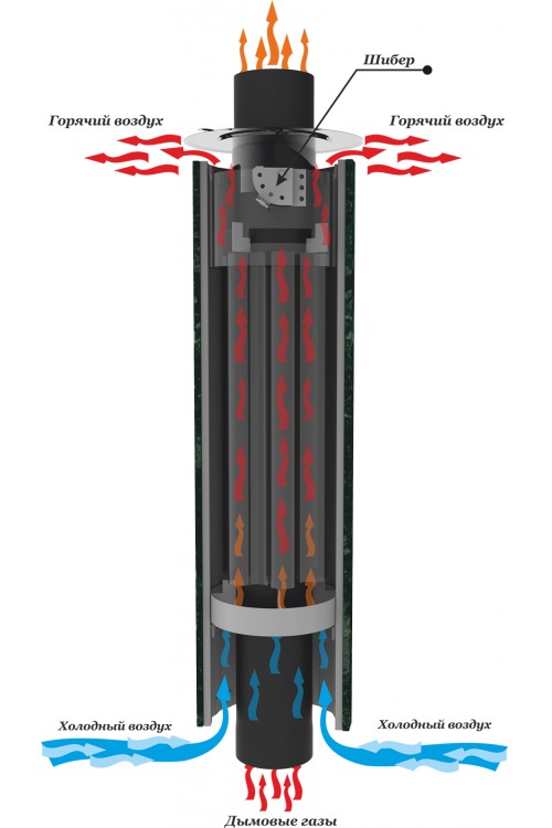 Дымоход-конвектор - элемент дымохода, с регулируемой конвекцией. Используется для повышения КПД печи за счет конвекции воздуха в помещении. Конвекция осуществляется через заданные каналы за счет регулируемой циркуляции воздуха. Возможность регулировки прогрева парной.