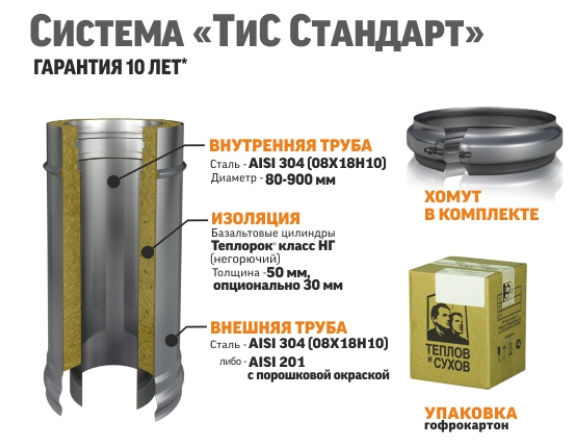Для производства «ТиС Стандарт» применяются только нержавеющие аустенитные стали. Они обладают более высокими по сравнению с ферритными сталями коррозионными свойствами в агрессивной коррозионной среде при высоких температурах. Элементы системы выпускаются в диапазоне диаметров от 80 до 300 мм. Система может быть выполнена в 2-х вариантах – МОНО и ТЕРМО. Внутренняя труба изготовлена из нержавеющей аустенитной стали марок AISI 304. Это высоколегированные стали, обладающие высокими коррозионными свойствами при длительном использовании при высоких температурах, особенно в кислой среде. Наружная труба изготовлена из нержавеющей стали марки AISI 304, либо из оцинкованной стали, возможно изготовление из нержавеющей стали с порошковой окраской. Эти стали обеспечивают длительную устойчивость к воздействию окружающей среды. Изоляция – цилиндры «Теплорок» из базальтовой плиты плотностью не менее 80 кг/м. Толщина изоляции может быть 30, 50 и 100 мм. Нержавеющие аустенитные стали сварены TIG-сваркой в среде аргона, без доступа кислорода, что в дальнейшем обеспечивает высокую коррозионностойкость сварного шва. Применяемое топливо: твердое топливо, газ. Гарантийный срок службы — 10 лет.