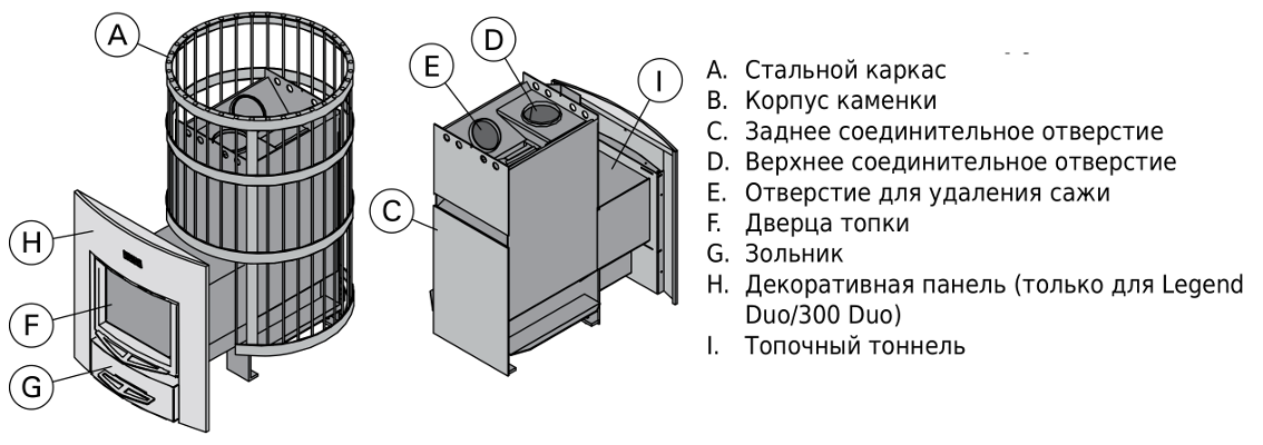 Корпус этой модели сделан в виде решетки. Он вмещает в себя много камней, которые накапливают жар и позволяют поддавать большим количеством воды. Благодаря открытой конструкции пространства для камней воду можно плескать прямо на всю внешнюю поверхность печи и получать восхитительно мягкий пар. Большое количество камней, находящееся внутри стильного металлического каркаса, по мере нагревания создаёт прекрасную атмосферу в парилке после того, как угасает огонь. Благодаря современной решётчатой конструкции повышается эффективность сжигания дров. Данная конструкция дровяной печи позволяет также сокращать безопасные расстояния до горючих материалов в сравнении с обычными печами-каменками и более свободно планировать пространство парилки. Дровяная печь HARVIA Legend 150 SL оснащена топочным тоннелем. Закладка дров в печь осуществляется в предбаннике. Благодаря регулируемым ножкам печь-каменка легко устанавливается на неровном полу.