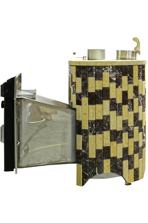 Печь для бани от завода Ферингер, в облицовке Ламель, может быть изготовлена из камня жадеит, окаменевшее дерево «перенесённый рисунок»