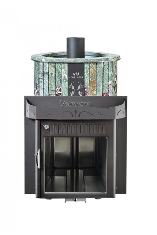 Дровяная печь Vohringer Оптима "До 23 м³" - Облицовка "Жадеит + Россо Леванте" - Обрамление "Камень"