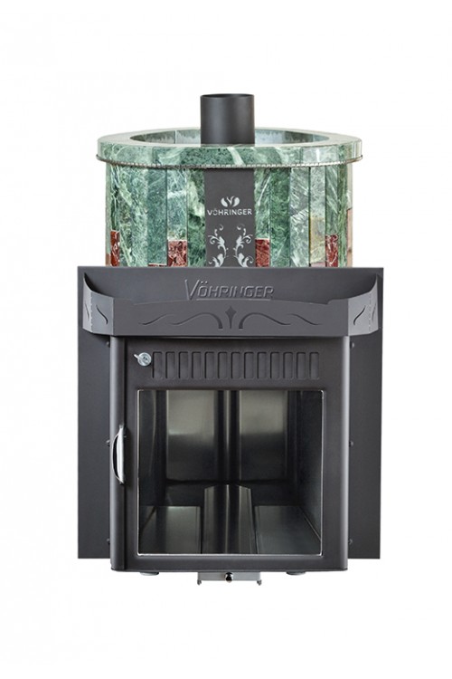 Дровяная печь Vohringer Оптима До 23 м³' - Облицовка 'Змеевик + Россо Леванте' - Обрамление 'Камень'